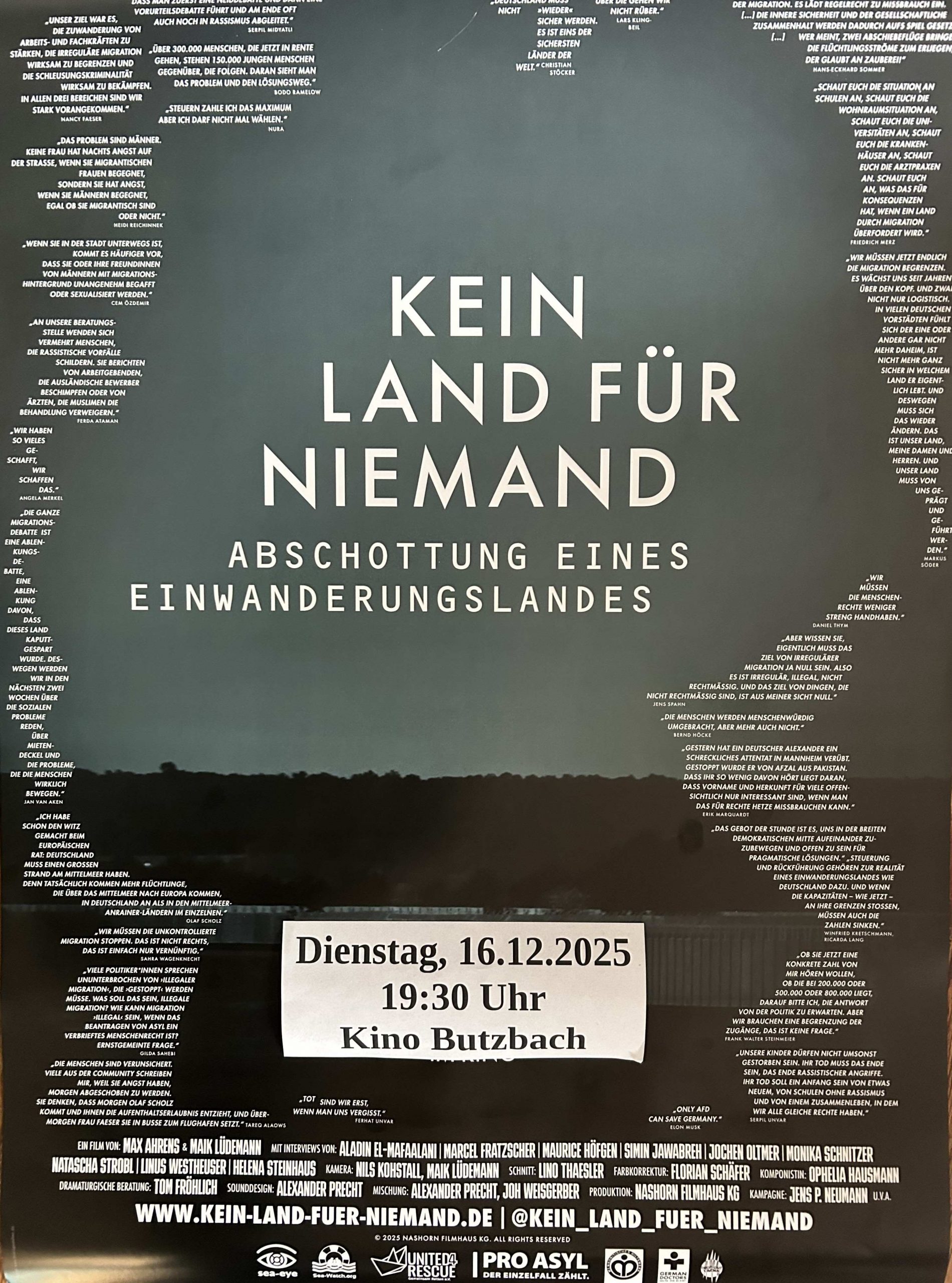 Am Dienstag, den 16. Dezember 2025 um 19:30 Uhr präsentieren das Butzbacher Bündnis für Demokratie und Menschenwürde e.V. und die Butzbacher Stiftung Kultur und politisches Bewusstsein in Kooperation mit der Heinrich-Böll-Stiftung Hessen e.V. den Dokumentarfilm „Kein Land für Niemand – …